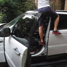 No screws or bolts needed. Your car already has what it takes to hook up this step tool. Every front door on a car has what is known as a striker hook or plate: it’s the D-shaped ring that sticks out. Just hook your Universal Car Footstep onto this, and you’re set. When you’re done doing what you need to do on the car rooftop, simply unhook the step.